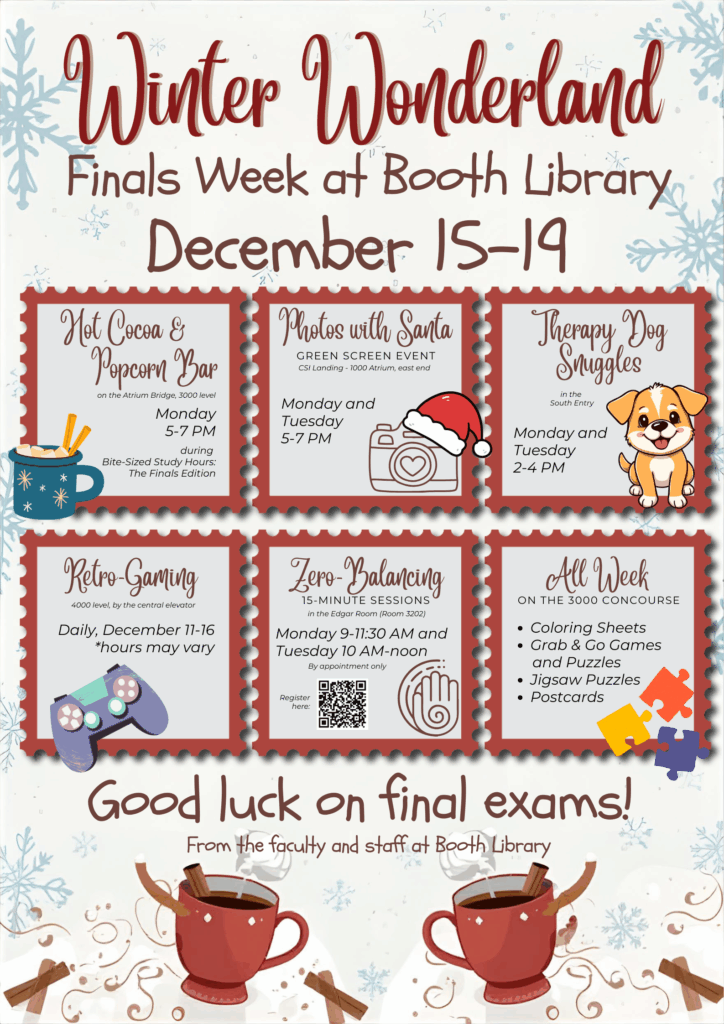 As the end of the fall semester approaches, Booth Library will offer many activities to help students focus, relax, and succeed. Join us for our Winter Wonderland Finals Week at Booth Library for festive and fun activities! Look through the list of events happening during finals week this semester:
