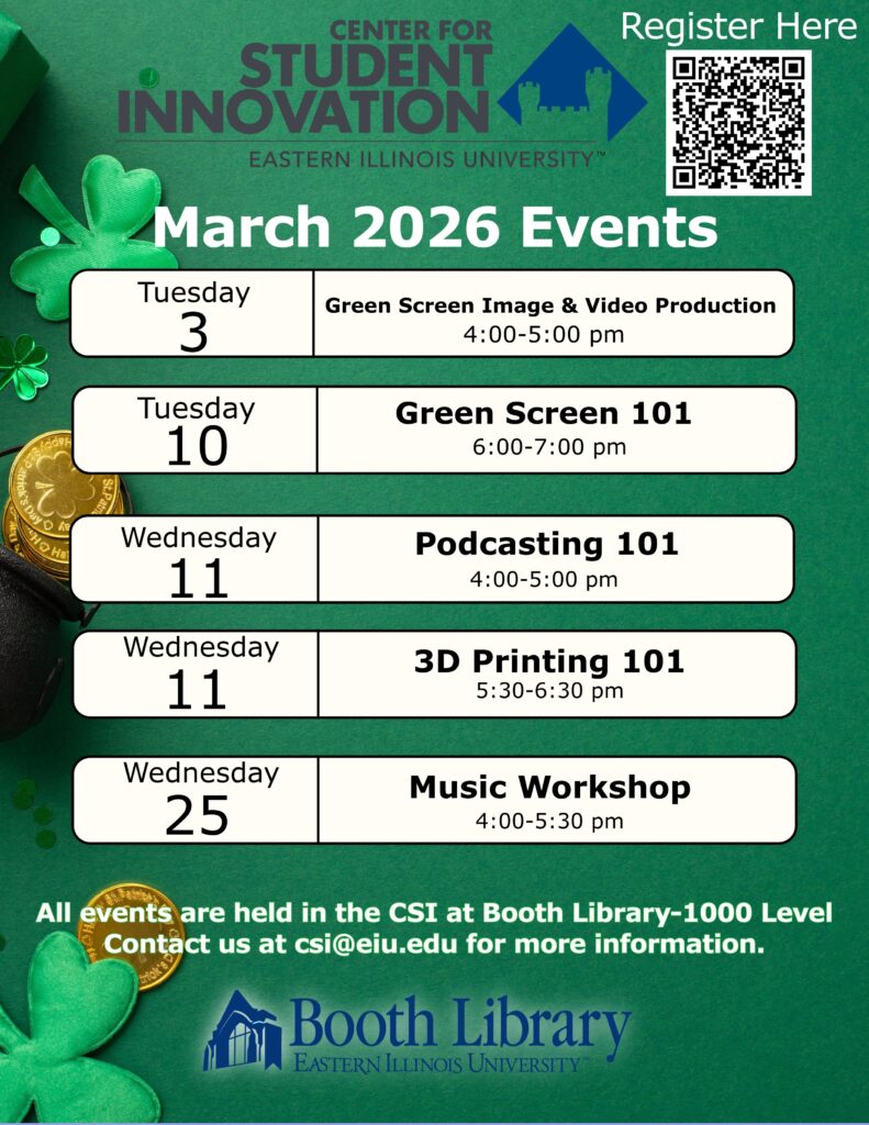 All workshops take place at the 1000 level of Booth Library in the Center for Student Innovation. Register to attend CSI workshops and learning labs through LibCal. For more information, please contact the CSI at csi@eiu.edu.