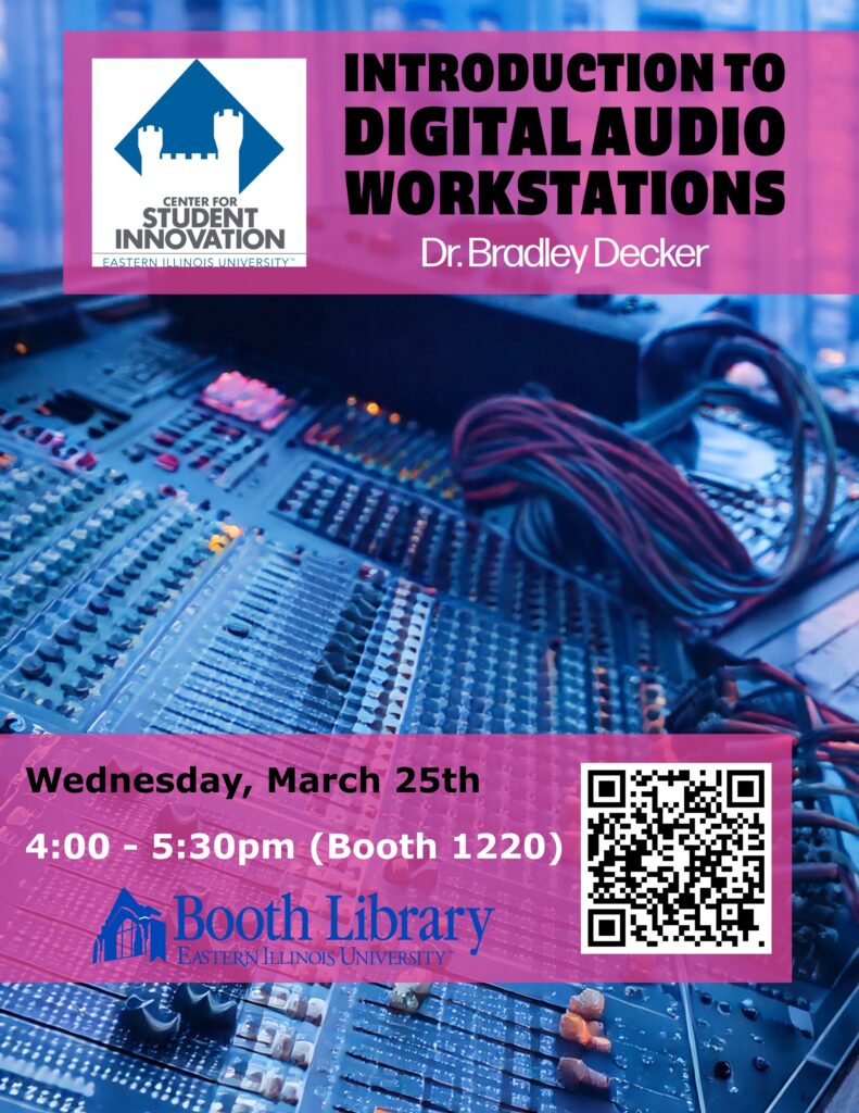 Booth Library’s Center for Student Innovation invites the EIU community to attend the Introduction to Digital Audio Workstations workshop on March 25th from 4-5:30 pm.