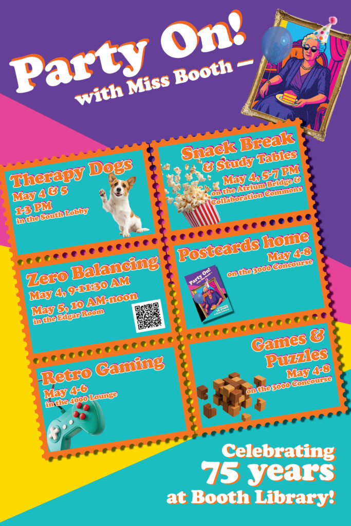Booth Library offers a series of Finals Week activities to provide opportunities for you to relax and enjoy yourself during the end of this semester! We hope you’ll join us for our fun-filled week: